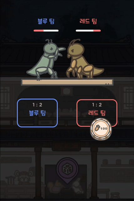 그러면 사마귀 두 마리가 나오는데 이 중에 어떤 친구가 이길지 내기를 하는 게임이다.